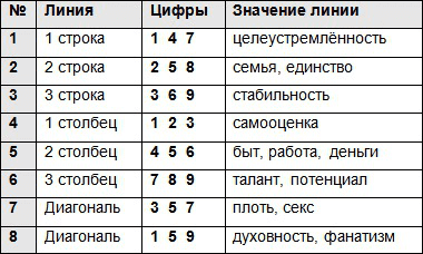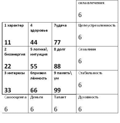 Квадратная таблица содержит три ряда, по три ячейки в каждом. Все ячейки пронумерованы 1-9 и отвечают за определённые качества личности: 1 - воля, характер; 2 - энергичность; 3 - способности к обучению; 4 - состояние здоровья; 5 - логика; 6 - трудолюбие; 7 - везение; 8 - доброта, терпимость; 9 - память. Цифры, составляющие дату рождения, записываются в ячейки, если какая-то цифра отсутствует в дате рождения – соответствующая ячейка пустует.